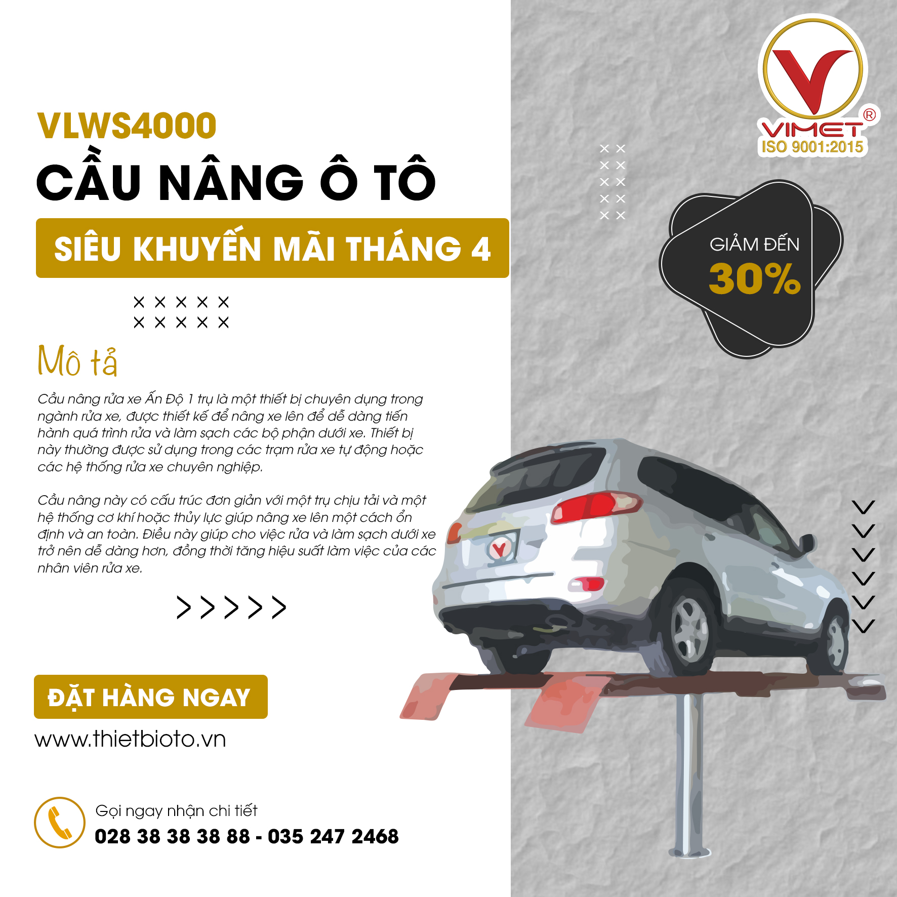 Cầu nâng rửa xe 1 trụ VLWS3501 là cầu nâng được thiết kế nhằm đáp ứng cho công việc rửa xe ô tô nhẹ nhàng và hiệu quả trong thời đại công nghệ 4.0. Cầu nâng rửa xe 1 trụ VLWS3501 được sản xuất và phân phối bởi Công ty cổ phần thiết bị Việt Mỹ sau thời gian tìm hiểu và nghiên cứu nhằm tối ưu hóa chi phí và hoạt động của trạm rửa xe tại thị trường Việt Nam.